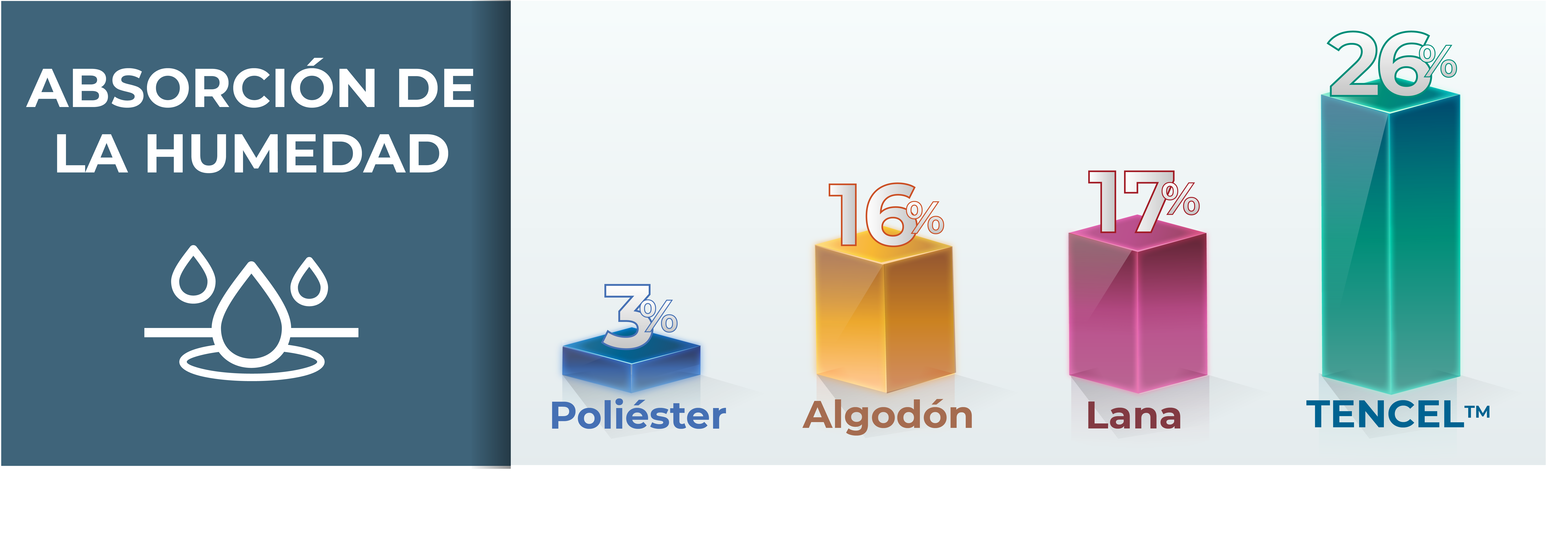 La capacidad de absorción de la humedad de las fibras TENCEL™ es la más alta del mercado, con una distribución mucho más homogénea. Asimismo, su capacidad de disipación y secado es muy superior al del resto de tejidos.